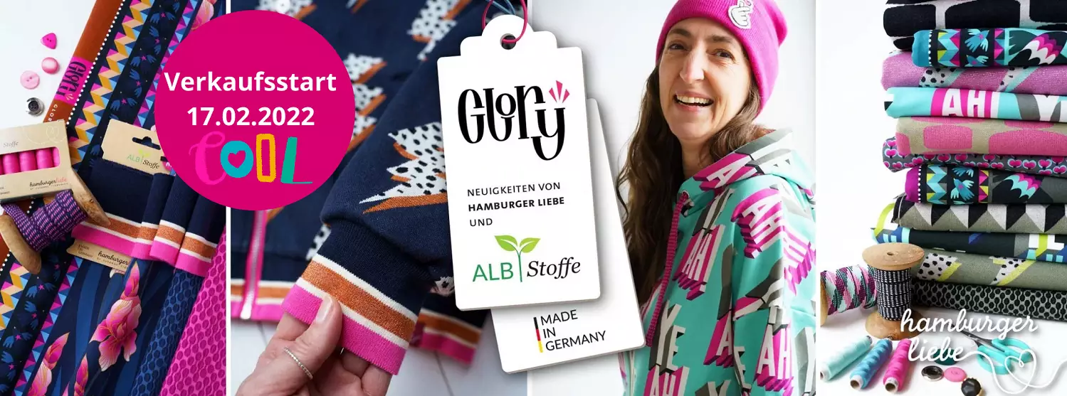 Wirf einen Blick auf die kleine und edle, limitierte GLORY Kollektion von Hamburger Liebe & Albstoffe. Setze kreative Ideen mit wunderschönen und kuschelweichen Glitzer Jacquards mit Soft-Touch Lurex, edlen und glamourösen GOTS zertifizierten Digital Prints um und nutze dabei perfekt kombinierbaren Cuff Me, Stripe Me und Twist Me für grenzenlose Kreativität. Eine ganz besondere Premiere: Der GLOW Lily Nachfolger GLORIOUS IRIS.