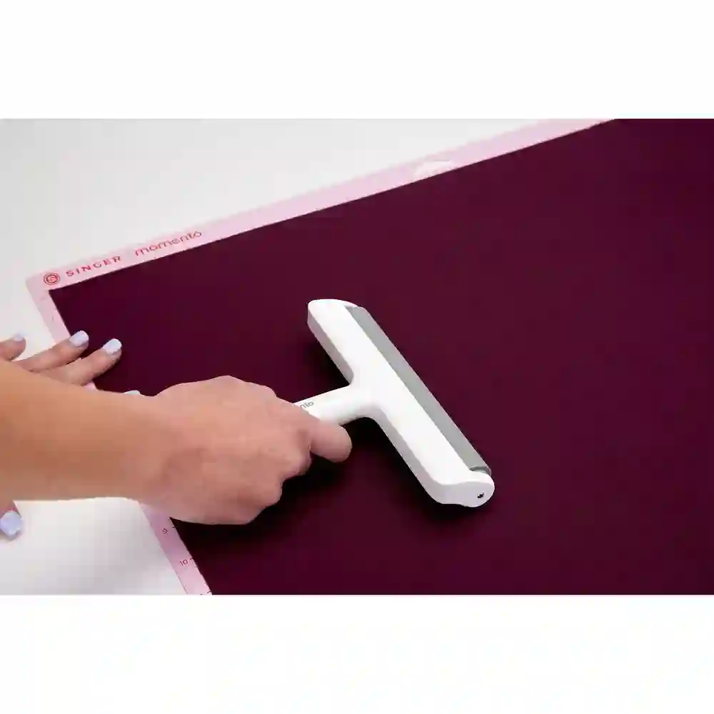 Verwenden Sie den Anpressroller, um Stoff auf die Fabric Grip Matte zu legen. Entfernt Falten und Blasen, lässt den Stoff flach liegen und ermöglicht einen sauberen Schnitt mit Ihrer SINGER momento Schneidemaschine.